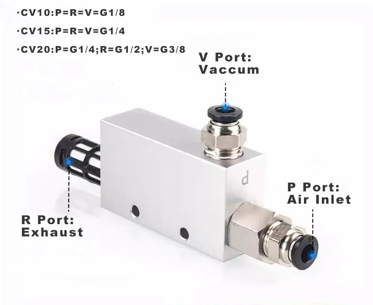 Ouleikai (အယ်လ်စွမ်း) CV ဖုန်စုပ်စက်များသည်စုတ်ယူခြင်း nozzle သို့မဟုတ် follures များအတွက်လိုအပ်သောလေဟာနယ်ပတ်ဝန်းကျင်ကိုထောက်ပံ့ရန်အသုံးပြုသည်။ စားသုံးမှုဆိပ်ကမ်းကို compressed air နှင့်ချိတ်ဆက်သင့်သည်, စုတ်ယူခြင်းဖလားသည်လေဟာနယ်ဆိပ်ကမ်းနှင့်ချိတ်ဆက်ထားပါသည်။ Compressed Air Port မှ Port Port မှအိပ်ဇောဆိပ်ကမ်းသို့သွားသောအခါလေဟာနယ်ဆိပ်ကမ်းတွင်လေဟာနယ်ကိုထုတ်လုပ်သည်။ ဤလေဟာနယ်အင်အားသည်အရာဝတ်ထုများကိုလိုက်နာရန်, ပြင်ဆင်ခြင်းသို့မဟုတ်ပံ့ပိုးမှုကဲ့သို့သောလုပ်ငန်းများကိုရရှိရန်အတွက်အသုံးပြုနိုင်သည်။