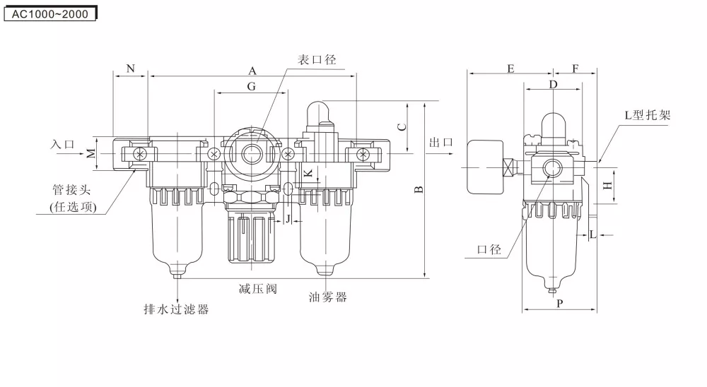 AF (Air Filter) + AR (Pressure Regulating Valve) + AL (Oil Mist Lubricator) = AC Triple Unit