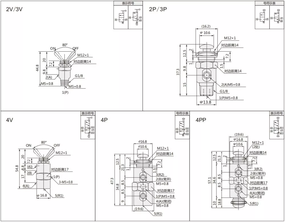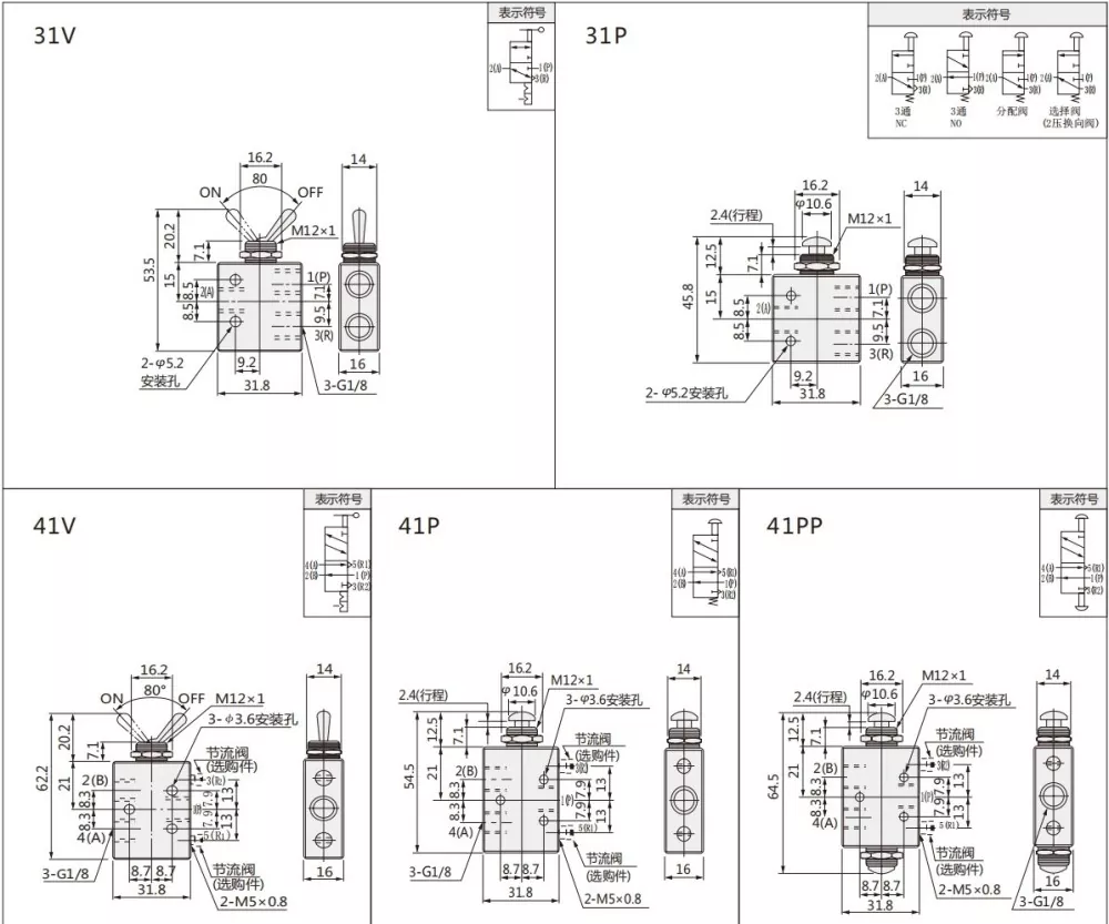 TAC စီးရီး Toggle Valve တွင် 2 နေရာအနေအထား 2 နေရာတွင်ရှိသည်။ 2 အနေအထားတွင် 2 နေရာ 3 နေရာနှင့်ရာထူး 2 နေရာမှာ 2 နေရာနှင့် 2 ခုခေါင်းစဉ်များရှိနိုင်သည်။ M5, G1 / 8 အမျိုးအစားများ။